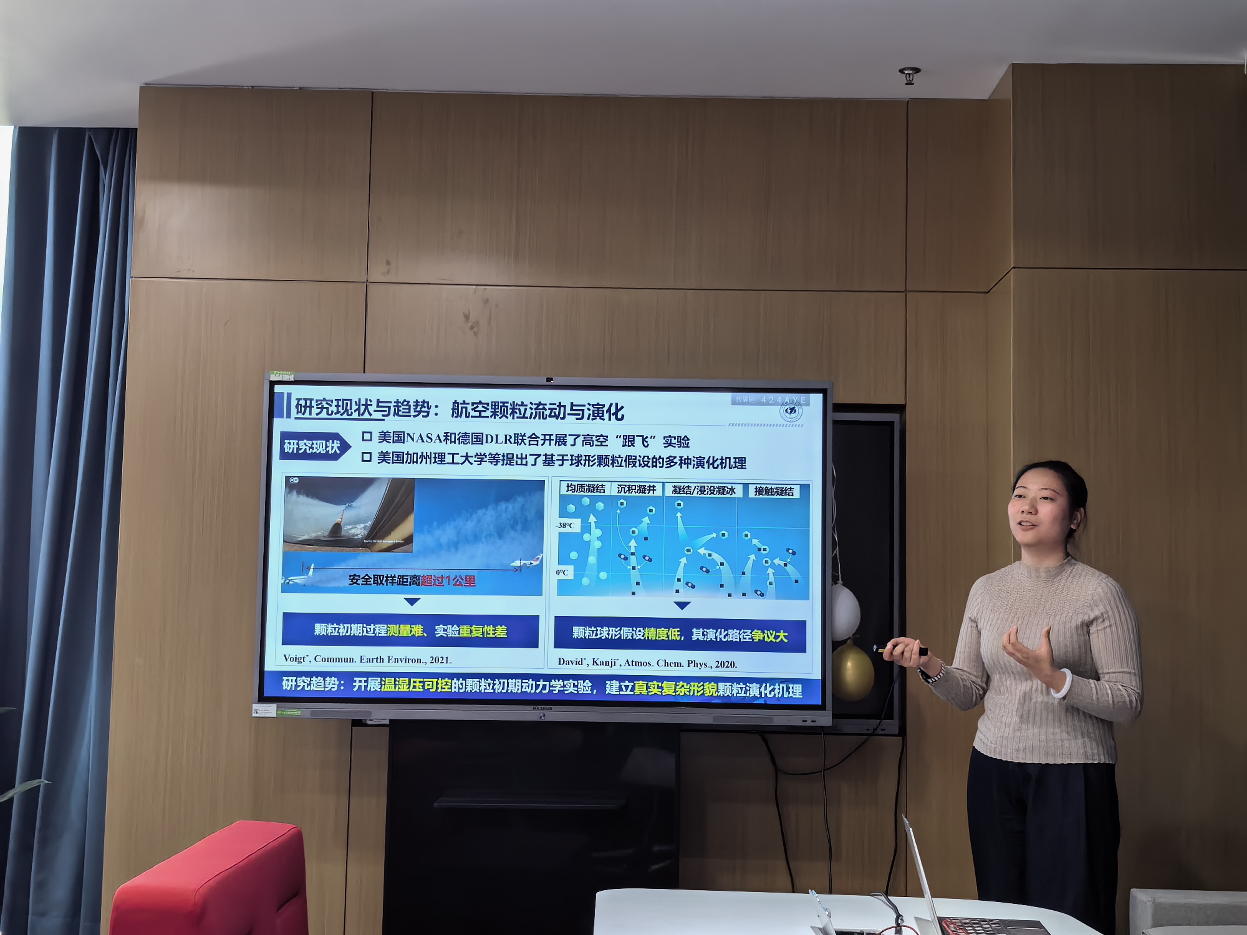 之后,能动学院副教授胡雪欢以《航空发动机排放颗粒微观特性及故障诊断研究》为题,针对当前航空发动机适航取证对排放颗粒物监测的紧迫需求,介绍了课题组在颗粒生成机理、微观特性表征与故障智能诊断等方面的学术思路和研究进展。报告系统阐释了如何通过先进光学测量与化学分析手段,深入揭示航空排放颗粒的生成演化规律,精确捕捉燃料改性对颗粒微观形貌、粒径分布及化学组分的调控机制,为建立基于排放颗粒特征的发动机运行状态反演模型提供关键理论支撑;同时展示了以排放颗粒监测为技术基底,向尾迹颗粒故障溯源与智能监测拓展的创新路径,令在场教师清晰理解了"燃烧产物微观特性"与"发动机健康管理"相结合的重要学术价值与工程应用前景。